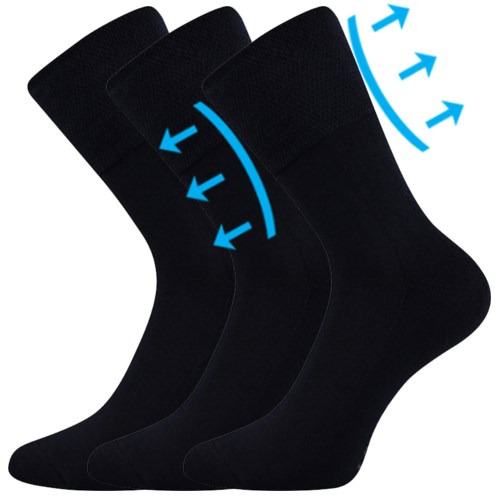 Ponožky mají speciální prodloužený extra volný lem který neškrtí ani silné nebo oteklé nohy, což ocení hlavně diabetici a osoby s problémy oběhového systému. Zesílené froté mají ponožky na chodidle, nárt a horní část ponožky je slabá. Špice je uzavřena náročnějším řetízkováním, díky kterému je spoj dokonale hladký a nehrozí, že ponožka bude tlačit. Vysoký podíl bavlny je velmi příjemný na omak a výborně saje pot.